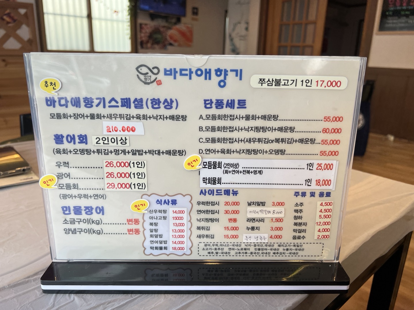 바다애향기는 모둠회, 모둠 물회가 인기가 많은 메뉴인데요,