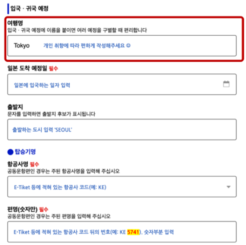 - 도착 예정일, 출발지, 비행기 편명 등을 입력해 주세요.