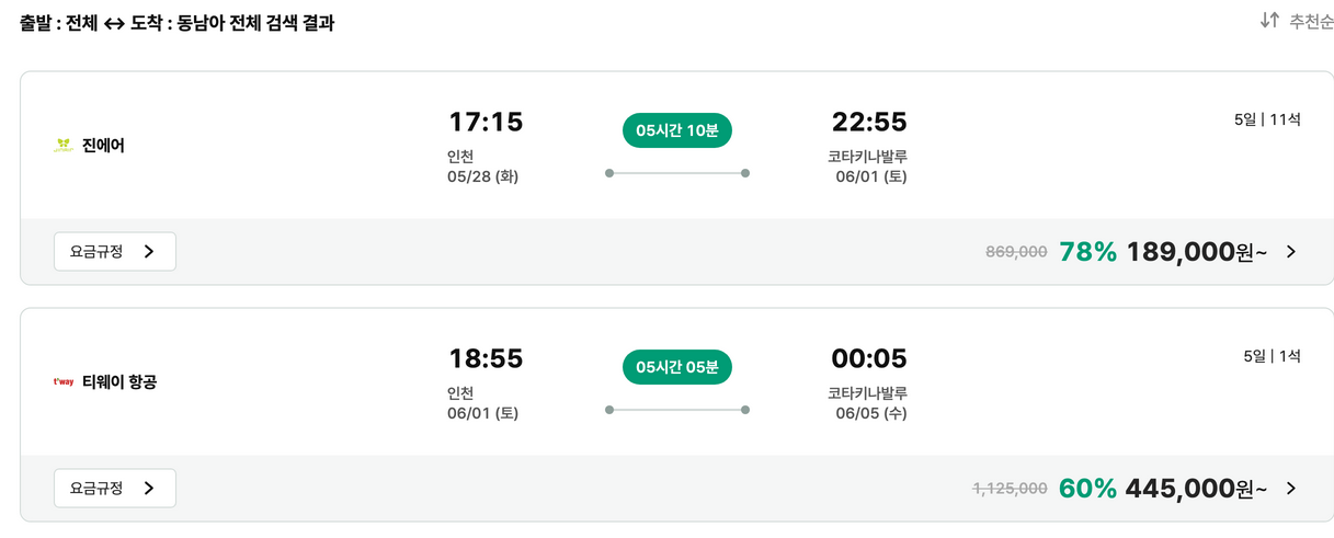 - 대부분 출발지가 인천으로 되어 있어, 이를 대한민국 전체로 설정해서 검색해 보세요.